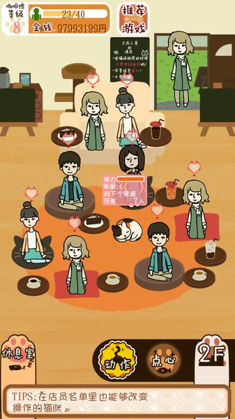 3、成长系统设计巧妙,通过完成各种任务和挑战可以让猫咪店员获得经验值升级,解锁更多特殊能力和装饰物品;
