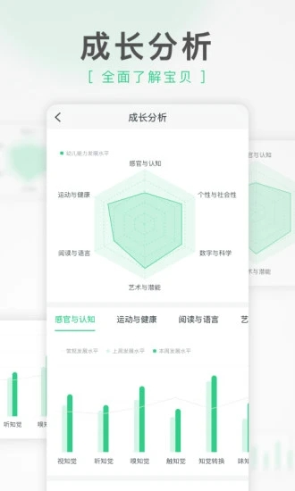 孩子在园里每一天的成长,变化,都以大数据的形式保存在了我们的后台系统里,同时家长端的APP里也有孩子的成长。从2岁到6岁的成长历程,点滴的变化与惊喜,组成了孩子幼儿时光最美的成长纪念册。
