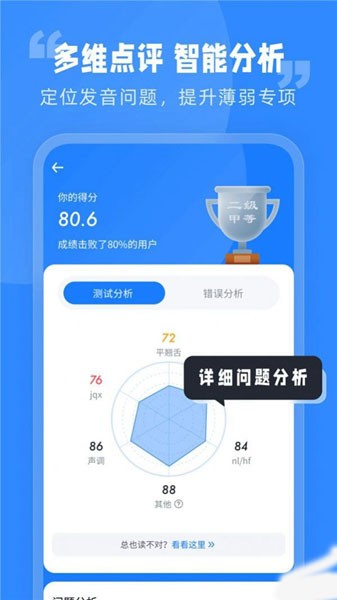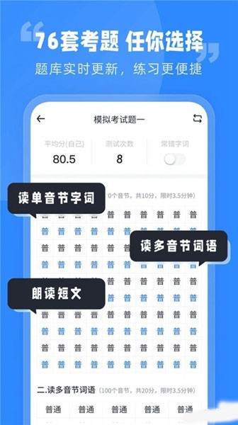 1. 移动便捷学习:支持离线使用,无论是在通勤路上还是休息间隙,都能随时打开软件进行学习,充分利用碎片化时间。2. 社交分享功能:可将学习成果一键分享至微信、微博等社交平台,与好友互动交流,获得更多学习动力。3. 丰富题型设置:包含单选、多选、填空、连线、情景对话等十余种题型,全面覆盖普通话考试所有考点。4. 实时学习反馈:每次练习后立即生成详细分析报告,直观展示发音准确度、语速控制等各项指标,帮助用户精准定位问题。