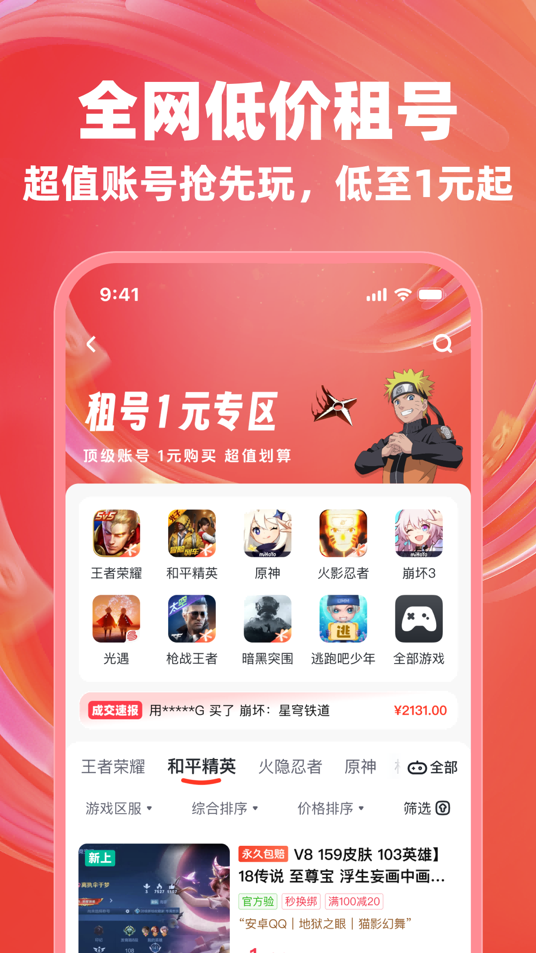 2、满足不同用户的游戏账号交易需求,更好的进行账号搜索:独创的智能搜索系统支持多维度筛选,包括段位、皮肤数量、英雄池等专业参数,帮助玩家快速定位理想账号。