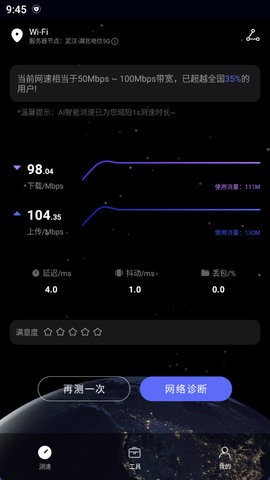 花瓣测速提供一键式测速体验,内置丰富的网络诊断工具,包括蹭网检测、视频质量测试和游戏延迟检测等实用功能。测速界面采用动态可视化设计,实时显示网络波动情况,让测试过程更加直观。应用会自动智能选择最优测试节点,并提供详细的网络诊断报告,帮助用户快速定位网络问题。在网络状态页面,用户还能查看周边WiFi信号强度分布图,了解无线网络环境。需要注意的是,软件默认使用Mbps作为带宽单位,用户可通过简单换算(除以8)得到实际下载速度的MB/s值。