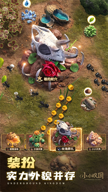 在神秘的地下蚁巢中,蕴藏着丰富的生存资源等待发掘。作为蚁后,你需要指挥工蚁挖掘四通八达的蚁道网络,在探索过程中会发现天然泉眼、优质玉露等珍贵水源,还能找到鼠妇群落等食物来源。同时也要警惕浸透的泥潭、流动的沙地等危险地形,这些既是挑战也是修补巢穴的重要资源。通过不断探索,你将逐步揭开地下世界的神秘面纱,为蚁国发展奠定坚实基础。
