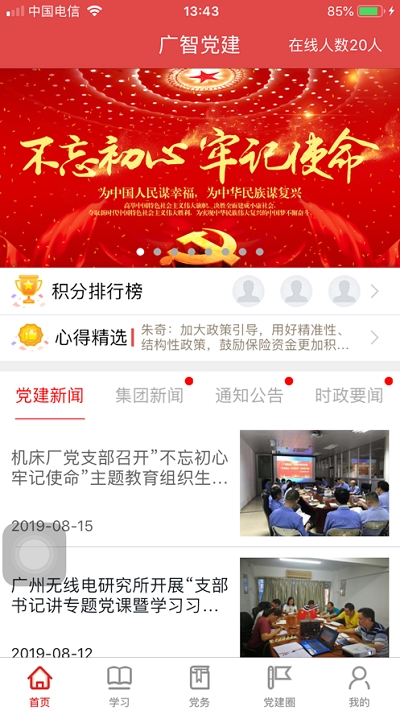 1、提供丰富的党建知识,随时在线学习。平台收录了从基础理论到最新政策的完整知识体系,包含文字、图片、视频等多种形式的学习资料,满足不同用户的学习需求。2、您还可以实时在线了解党建信息。系统与权威党建网站数据同步,确保信息的及时性和准确性,让用户第一时间获取重要资讯。3、还有各种党建服务可以满足您的需求。从组织关系转接到党费缴纳,从会议签到到活动报名,一站式解决各类党务需求。4、丰富的信息、强大的功能,给您带来最佳的体验。采用智能推荐算法,根据用户学习习惯推送个性化内容,提升学习效率和使用体验。