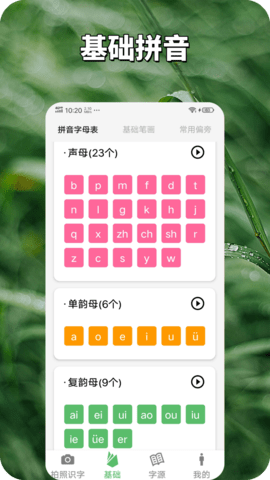 展示了关于汉字的基础拼音,对相关的拼音字母表可以随时查看,轻松掌握。系统化的拼音教学模块,帮助用户打好语言基础,为后续学习奠定坚实基础。