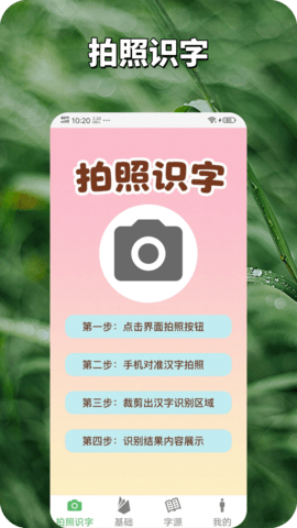 软件为用户提供了拍照识字的工具,利用手机的拍照模式来轻松识别汉字,一键识别查找。这项功能特别适合户外学习场景,遇到不认识的字随时拍照查询,让学习无处不在。