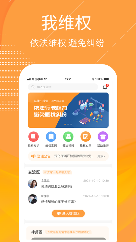 我维权app是一款专业高效的法律服务平台,致力于为用户提供全方位的维权解决方案。平台汇聚了全国各地的资深律师团队,覆盖劳动纠纷、消费维权、合同争议等多个法律领域。用户可以通过app随时随地在线咨询法律问题,获取专业建议。平台还提供丰富的普法学习资源,包括法律知识文章、典型案例分析和视频课程,帮助用户提升法律意识。无论是个人还是企业用户,都能在这里找到适合自己的维权途径,让法律维权变得更简单便捷。