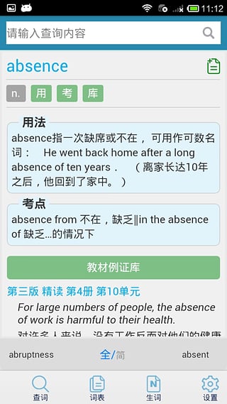 紧密结合考试和教学需求。App特别标注了大学英语四六级和硕博阶段的核心词汇和词组,并提供来自教材的真实例证。这些针对性强的学习资源能有效帮助用户备考,同时满足日常英语教学需求,实现学考结合。