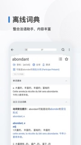 例句库包含20000+条来自FranceInter等媒体的原声素材,所有例句均标注CEFR等级。长按单词可查看其在《小罗贝尔词典》中的权威释义,并听到地道巴黎口音朗读。