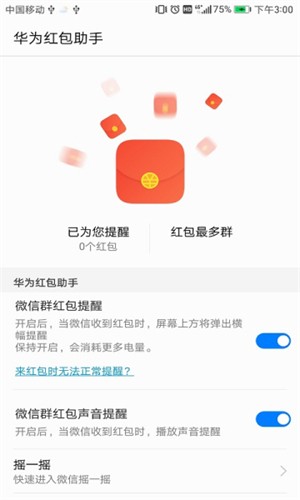 注意:1、仅限华为EMUI3.0及以上机型使用,部分机型可能无法适配,敬请谅解,请尝试到华为应用市场下载最新版本。2、若来红包没有提醒,请在应用首页点击"来红包时无法正常提醒?"链接进入FAQ指导,对微信、QQ进行设置即可。