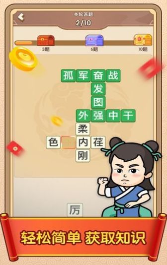 这款游戏创新性地将四书五经中的经典成语转化为趣味互动考题,每个关卡都像打开一本立体成语词典。系统会根据玩家等级智能匹配题目难度,从小学课本常用成语到《世说新语》中的生僻典故层层递进。特别设计的"典故剧场"通过3D场景重现"完璧归赵""负荆请罪"等历史故事,让记忆更加生动深刻。每周更新的"成语大会"活动更可挑战全国玩家,在限时竞答中检验自己的真实水平,累计积分还能兑换珍贵古籍电子书资源。