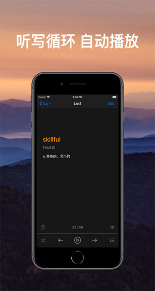 1、"批量导出":可将任意分类词表生成带例句的HTML文档,直接导入Anki等记忆软件。2、"桌面小部件":在iPhone锁屏界面即可查看今日待复习词数,长按组件还能快速启动听写模式。3、"PDF导出":生成可打印的单词手册时,可自主排版字体大小、添加记忆提示注释。4、"听写模式":独创的变速播放技术,能在保持音质前提下将语速调节至0.5-2倍速,适应不同听力水平。5、"拼写模式":卡片拼写环节融入游戏化设计,错误字母会触发震动反馈,连续正确可解锁特效动画。6、"混音":智能音量平衡技术确保单词发音不被背景音乐掩盖,支持分声道调节各音频源音量。