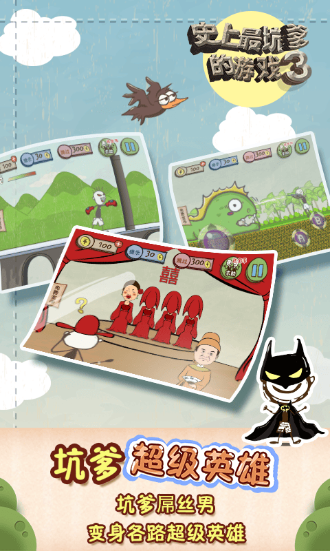 《最坑爹的游戏》是一款以恶搞和反套路为核心的休闲益智类手游,凭借其无厘头的关卡设计和颠覆传统的解题思路迅速走红。游戏通过看似简单却暗藏“陷阱”的谜题挑战玩家惯性思维,比如点击“开始”按钮可能直接触发失败,或是用物理常识无法解释的荒诞通关方式。开发者巧妙利用玩家对常规游戏的预期,设置大量黑色幽默元素,如虚假进度条、伪装成广告的过关键等,让玩家在屡屡受挫中收获意外笑点。该作适合喜欢挑战逆向思维、享受“被虐”乐趣的玩家,每关通关后都会呈现令人捧腹的吐槽字幕,形成独特的喜剧效果。