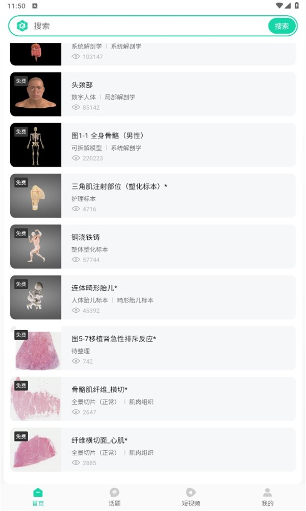 【搜索框】采用智能语义识别技术,支持中英文混合搜索及常见别名自动匹配。搜索结果会以3D热点图形式呈现相关结构的空间分布,点击即可进入详细学习界面。历史搜索记录会形成个人知识图谱,帮助用户建立系统的解剖学认知框架。