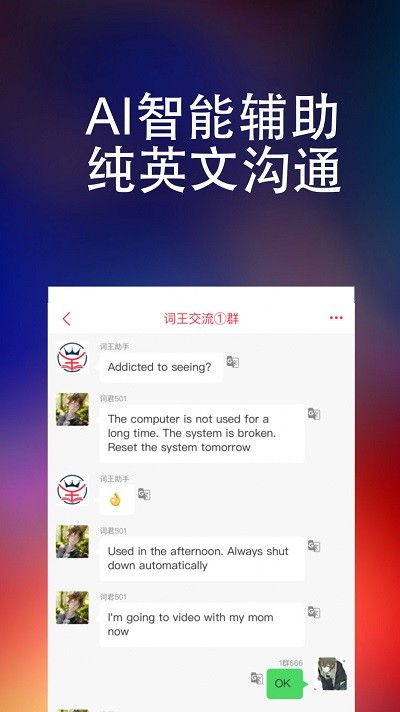 3、创新的图文结合记忆模式,配合AI智能辅助的纯英文交流环境,打造沉浸式学习体验,帮助用户快速提升英语水平;