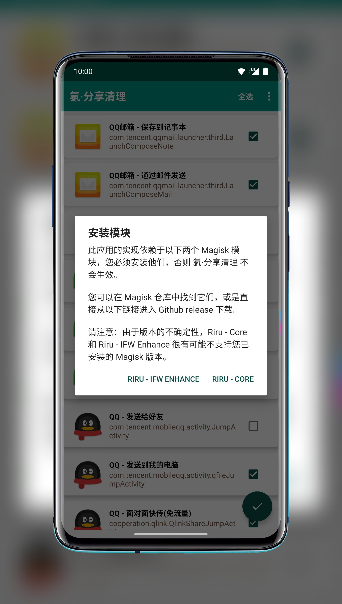 2.在MagiskManager的「下载」页面中搜索并安装Riru-Core和Riru-IFWEnhance模块,或者直接访问它们的Githubrelease页面下载(相关链接可在「氡·分享清理」应用内找到);