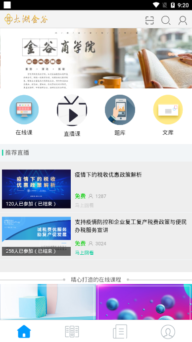 太湖金谷App提供四大核心功能模块:在线课程支持随时随地点播学习,包含2000+课时专业内容;直播课堂实现实时互动教学,年举办300余场专题培训;智能题库拥有5000+道精选试题,配套自动批改和错题分析功能;专业文库汇集监管文件、案例解析等实用资料,支持关键词检索和分类浏览。这些功能相互配合形成完整的学习闭环,满足用户从知识获取到能力测评的全流程需求。