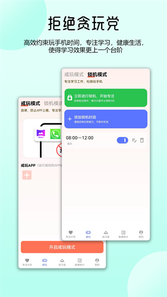 智能戒玩模式:一键锁定分散注意力的应用程序,设置学习期间白名单,从根本上减少手机依赖;