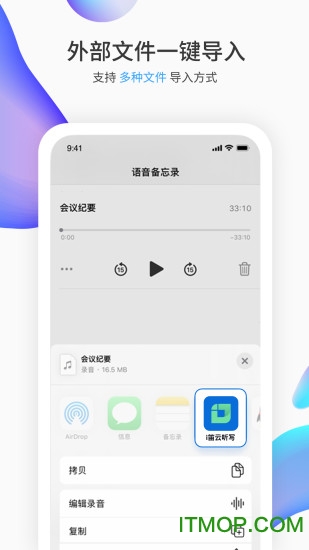 【多样化文件处理】支持主流音频格式导入导出,一键分享功能让协作更简单,满足各类办公场景需求。