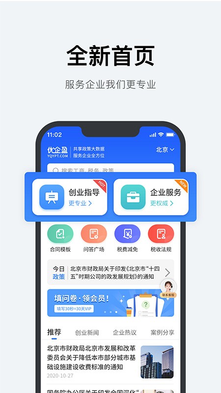优企盈官方版是一款专为初创企业及中小企业管理者打造的一站式企业服务应用。该软件集成了工商注册、财税管理、政策查询等核心功能,帮助用户高效完成企业日常运营中的各项事务。通过智能化的行业政策推送和专业的财税课程,让创业者快速掌握企业经营要点。同时提供海量合同模板和人力资源工具,满足不同发展阶段的企业需求。无论是公司注册、社保开户还是税务申报,都能在这里找到专业解决方案。