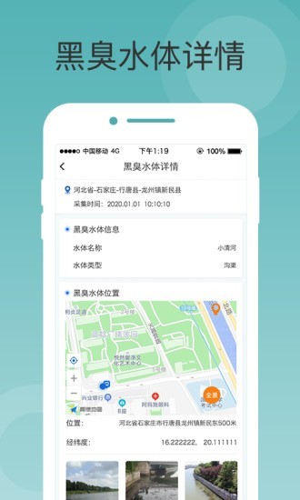 会在地图上显示黑臭水的位置,让你知道黑臭水的具体位置,便于寻找和记录,地图支持缩放、测距等实用功能,定位精度可达米级;
