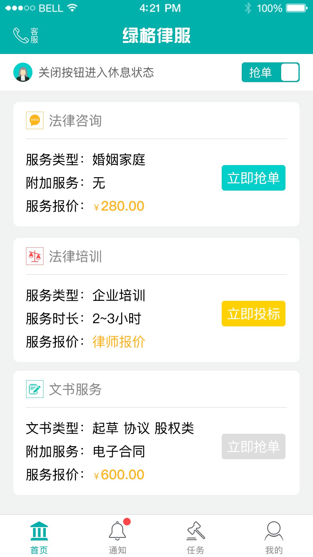 任务查看:清晰展示待处理、进行中和已完成的法律服务项目,方便用户随时掌握进度;