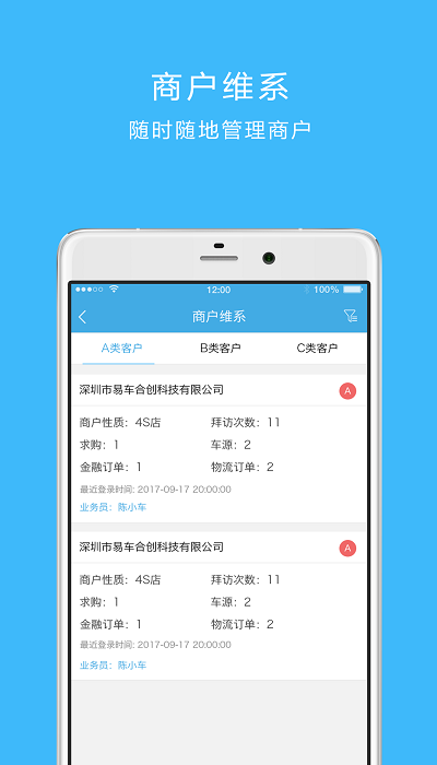 在应用中就能实现商户维系的功能,可实时了解商户的情况,通过智能数据分析帮助用户掌握商户动态变化趋势;