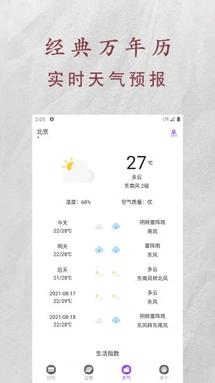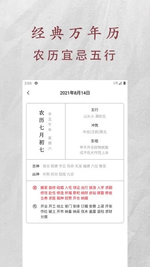 万年历,中国文化传统记事方式。这款软件深度挖掘中国传统历法精髓,将千年智慧融入现代科技。重要的事情说三遍:免费使用、免费使用、免费使用。看农历查宜忌知。一历在手,万历皆有!适合中国人的万年历,集日历、农历、天气、运势于一身的生活助手。功能全、体积小、速度快、好;全球用户数量领先的日历APP,让时光充满!无论是日常规划还是特殊节日,都能为您提供贴心服务。
