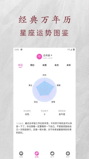 提供公历、农历、天气、日程、黄历、生日、节日等日历实用功能。天气:天气动态、未来一周天气、各类气候指数;软件支持精准定位,可获取所在位置的实时天气数据。星座运势,每日星座运势、一个月星座运势;为星座爱好者提供专业详尽的运势分析。日历:黄历宜忌、节日节气、吉日查询、查询;特别适合需要择吉办事的用户群体。