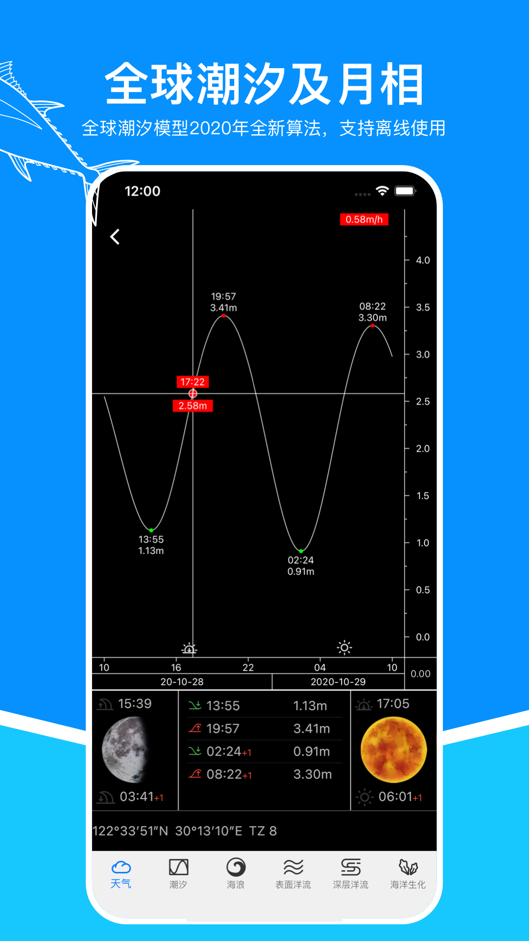 支持状态下查看收藏点实时潮汐、月相。潮汐预测模型由1个全球模型再加24个区域模型构成,全球超过3000万个网格化预测点,网格精度小于4KM。新增"潮汐日历"功能,可查询任意日期的大潮小潮时间,并标注最佳赶海时段,特别适合沿海渔民和潮间带研究者使用。
