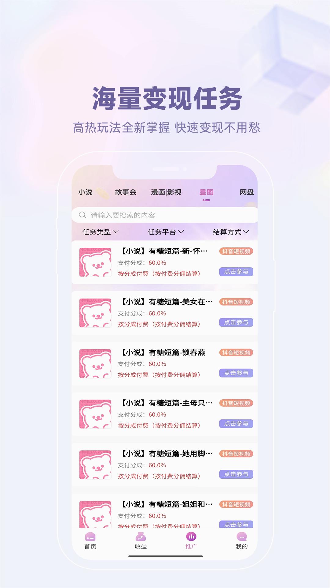 星推联盟app是一款专为短视频创作者量身定制的专业变现平台,致力于帮助用户轻松实现创作价值。平台汇聚海量优质变现任务,无论是新手还是资深达人,都能通过完成任务获得丰厚收益。独特的分享机制让优质内容传播更广,收益倍增。从内容创作到流量变现,星推联盟提供一站式解决方案,让短视频变现变得简单高效。平台还配备智能数据分析功能,帮助创作者精准把握市场趋势,打造爆款内容。