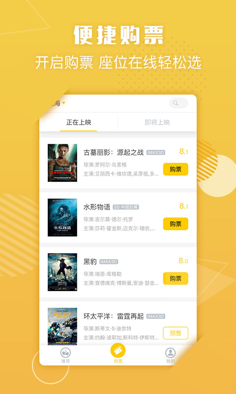 便捷购票,开启购票,座位在线轻松选;支持全国3000多家影院的在线购票服务,实时同步最新排片信息,让您随时随地轻松订票。