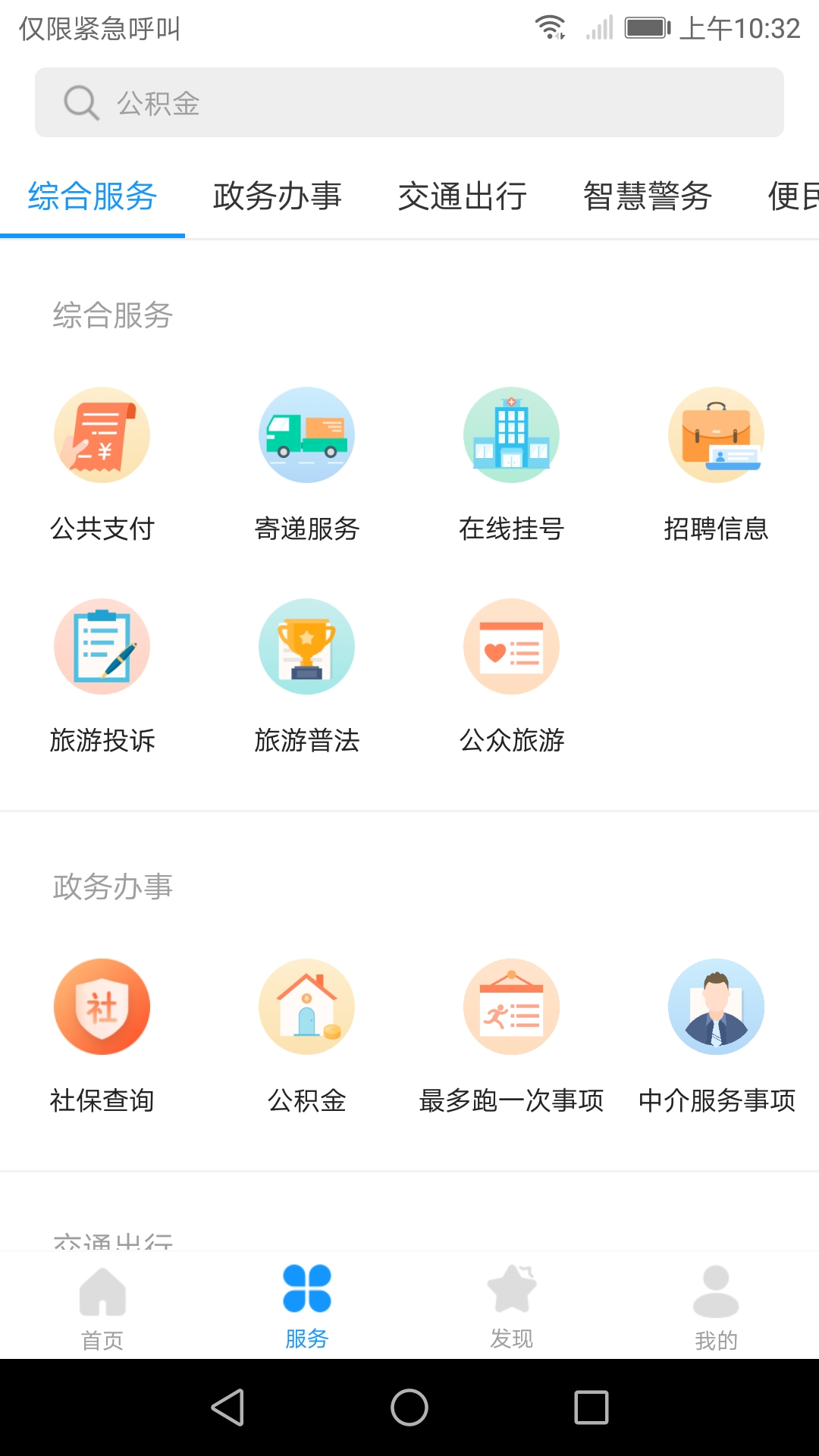 交通出行:包含公交查询、违章处理、停车缴费等出行服务