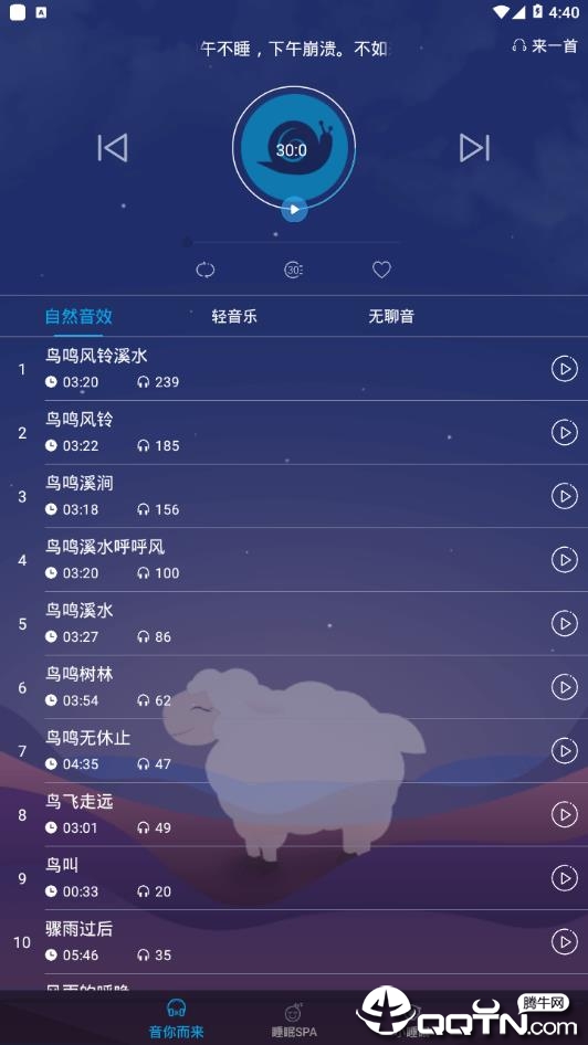 音你而来:提供超过100种精选音效,包括自然界的风雨声、流水声,以及专门设计的白噪音和阿尔法脑波音乐,满足不同场景下的放松需求。睡眠SPA:精心策划的情感电台栏目,涵盖爱情故事、亲情温暖、励志人生等主题,由专业主播用温柔声线娓娓道来,陪伴用户度过每个不眠之夜。小睡眠:个性化设置中心允许用户自由组合多种音效,创建专属的助眠方案,还能设置定时关闭和音量渐变功能。