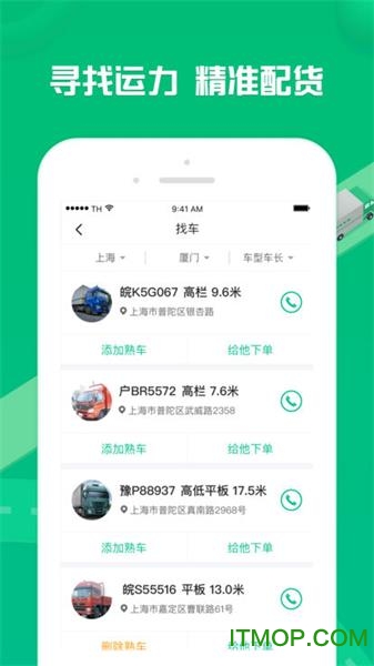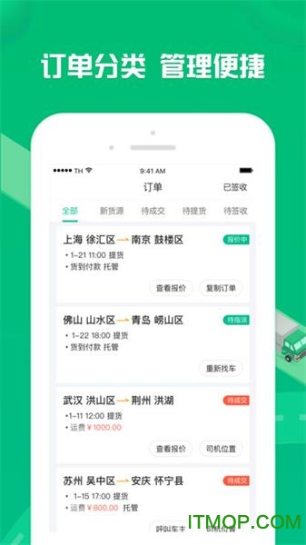 发货管理:简化发货流程,操作简单直观,等待竞价过程中可以查看司机评价,自主选定最合适的司机完成交易。