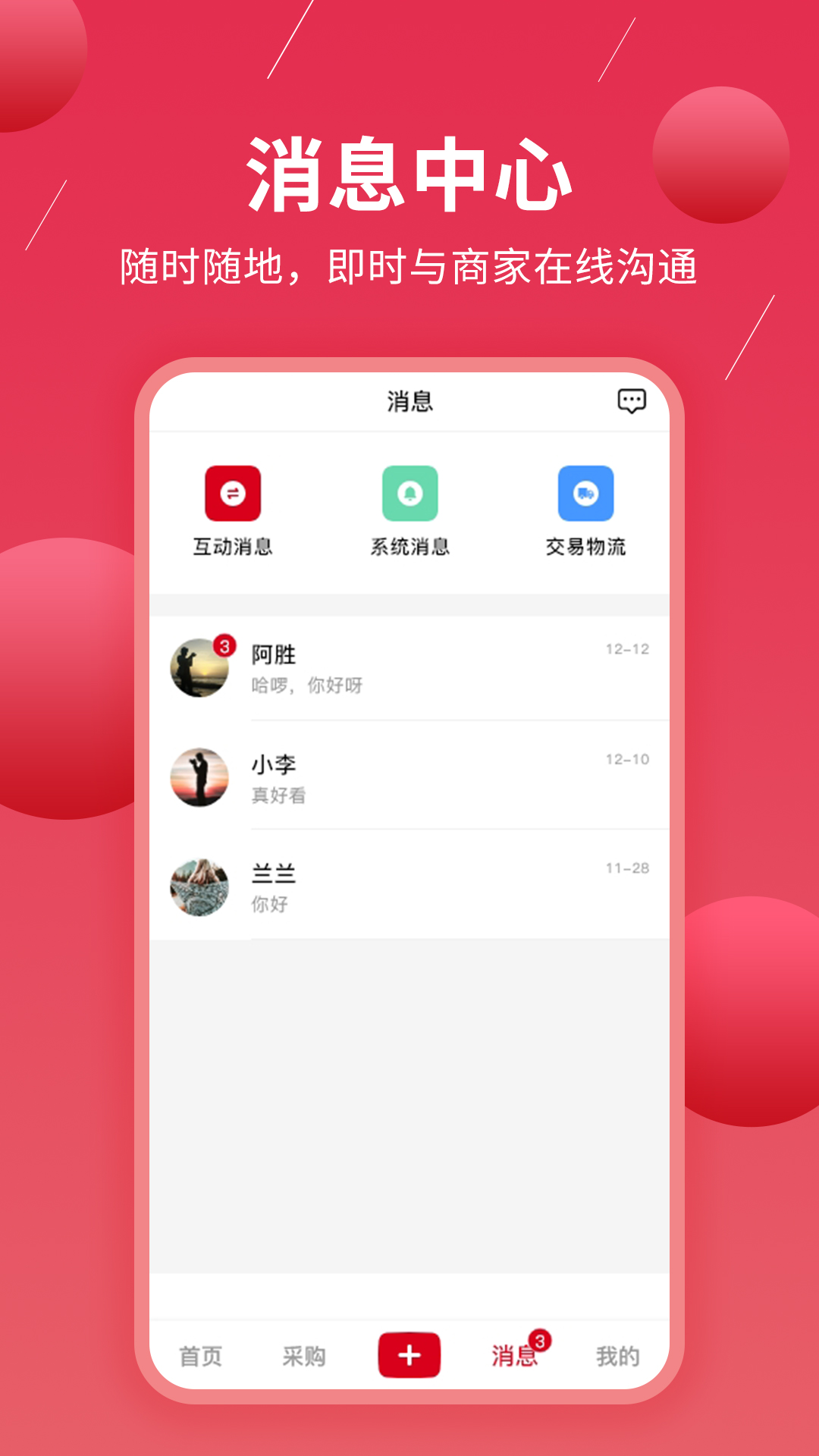 我的管理:支持多账号切换、收藏夹分类及历史订单归档,帮助用户高效管理采购全流程;快速找布:基于AI算法的智能推荐系统,可根据纹理、克重、价格等20余项参数精准筛选,3秒内呈现匹配结果;消息中心:集成即时通讯与文件传输功能,支持语音、图片、合同在线确认,沟通记录云端同步永不丢失。