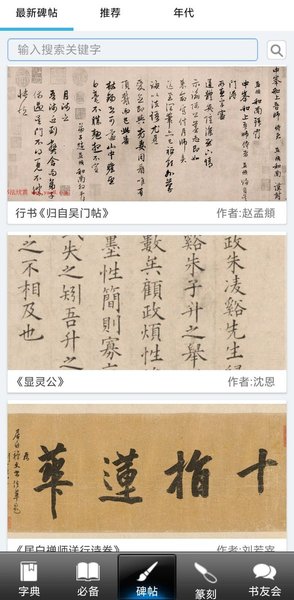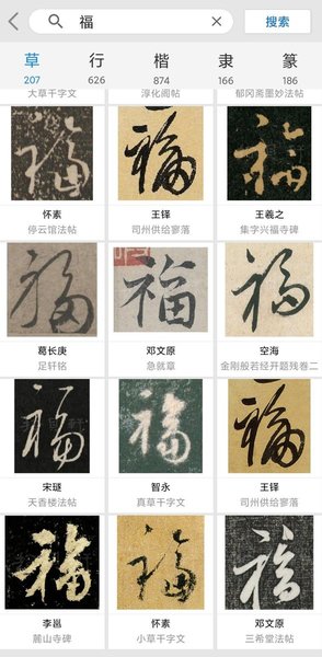 1. 多书体查询:支持篆/隶/楷/行/草五种书体一键切换展示