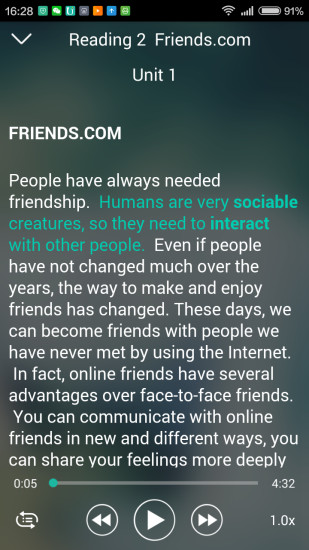 个性化:播放录音时支持左右滑动切换对照文本,点击任意句子即可跳转到对应位置。播放速度可自由调节,从0.5倍到2.0倍多档可选,满足不同英语水平用户的学习需求,打造专属学习体验。