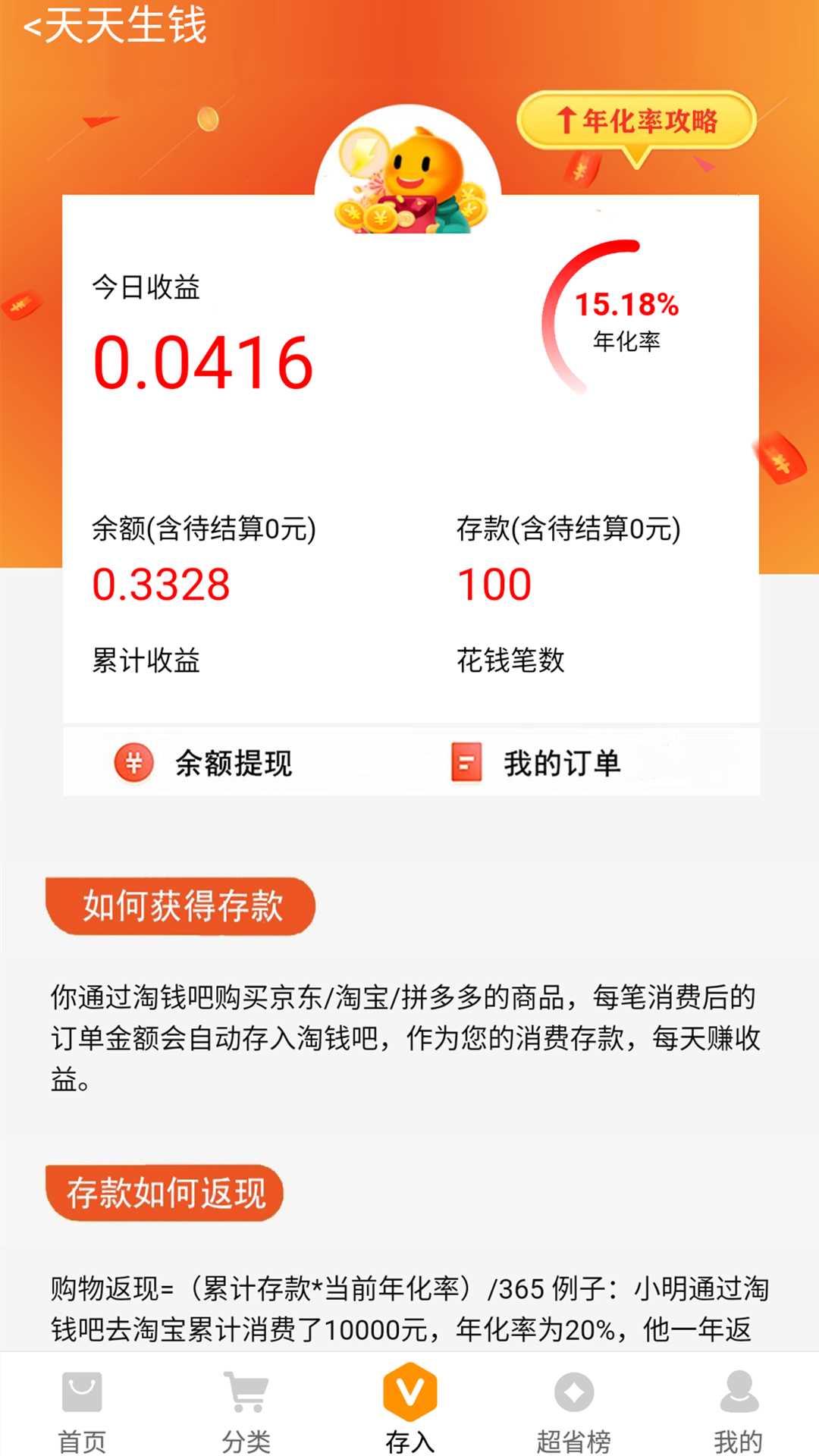 在淘钱吧,您每笔消费后的订单都会同步存入淘钱吧,以利率方式产生收益,让您在购物花钱后还能。这个创新的返利机制让您的每一笔消费都能产生额外价值,最高可获得10%的购物返现,真正实现购物赚钱两不误。