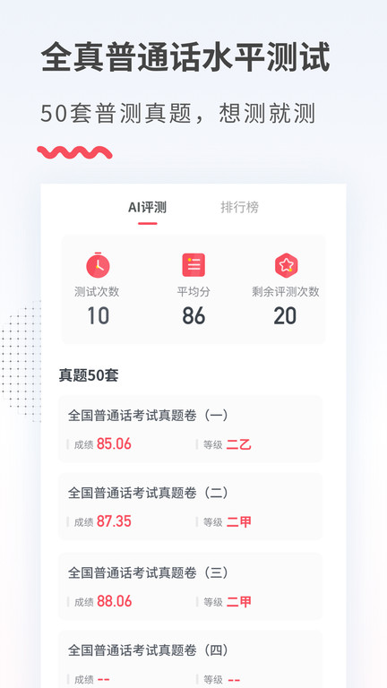 测试评分:采用先进的语音识别技术,对单字、词语、短文朗读等测试项目进行智能评分。题库涵盖普通话测试全部必考内容,包括3500个常用字词、60篇朗读短文和30个命题说话话题。
