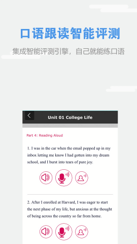 自主训练功能为用户准备了海量口语、笔试真题和模拟题资源,通过反复练习帮助用户掌握考试技巧,实现高分突破;模拟考试功能可以完整还原真实考试场景,用户可以进行口语和笔试的全真模考,系统会给出全面的能力诊断报告,让用户提前熟悉考试流程,做到心中有数;智能推荐功能会根据用户的学习水平和测试结果,精准推送专项训练内容,帮助用户有针对性地提升薄弱环节;视频课程板块汇集了名师精品课程,用户可以随时随地在线观看学习,轻松搞定四六级等各类英语考试备考;高分攻略栏目则提供了大量精品文章和提分秘籍,是考前冲刺的必备宝典。