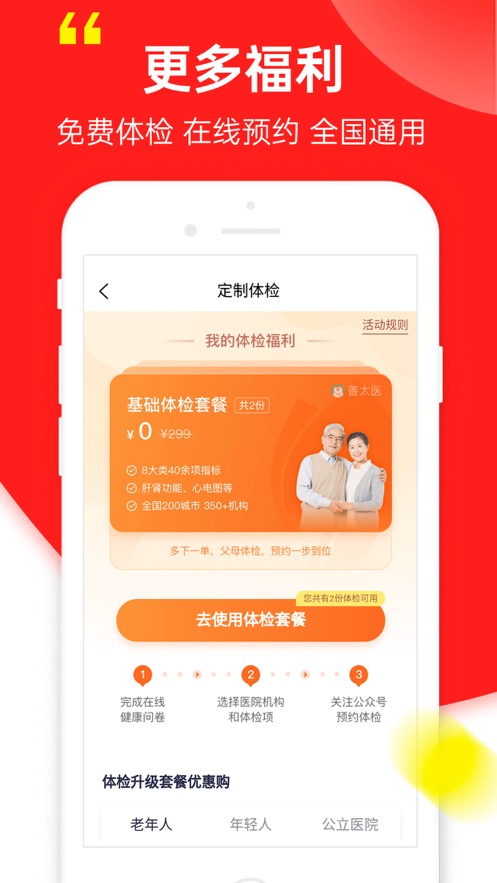 0元领取父母双人体检套餐,包含13项专业检查项目,全国2000+体检机构通用。平台还提供个人定制化体检方案,涵盖基础体检、深度体检、专项检查等多种类型。专业医生团队在线解读报告,定期推送健康建议。会员可享受体检套餐5-8折优惠,让健康管理变得更简单、更经济。