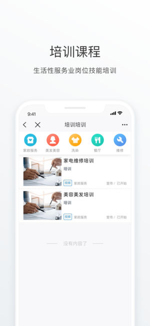 【培训课程】:提供涵盖母婴护理、老人照护、家庭保洁等家政服务细分领域的完整课程体系,同时包含洗染、家电维修等延伸服务行业的专业培训内容,课程形式包含视频教学、图文讲解和实操演示等多种形式。