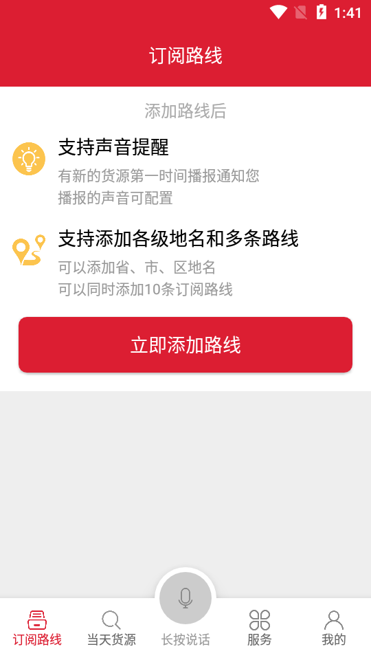 货站、物流园区、卡友帮、里程测距、附近找车、一键加油等实用功能一应俱全,全方位满足司机的日常需求。订阅路线功能支持声音提醒,当有新的货源信息时会第一时间语音播报通知,且播报声音可根据个人喜好进行个性化设置。平台支持添加各级地名和多条路线,包括省、市、区三级行政区划,最多可同时添加10条常用运输路线,让司机不错过任何优质货源。