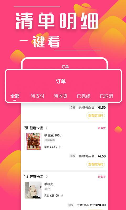 明细轻松查看提货码,为您打造简单、快乐的生活体验,购物流程简单明了,让您省时省力又省心