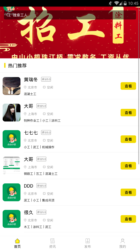 【工头找工人】实时跟进工头需求,帮助工头找到靠谱工人,可查看工人历史工作评价