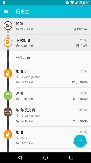 详细的成本统计:按加油、账单、服务等类别分类,支持成本/距离、年成本、月成本等分析