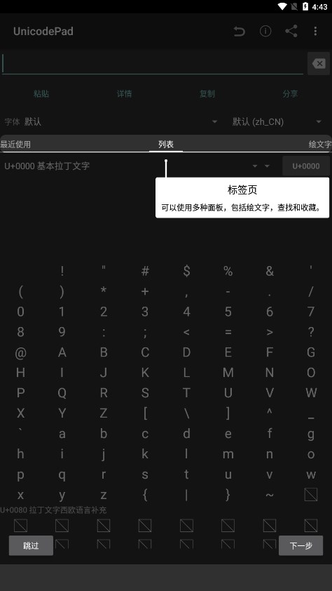 单击字符即可快速输入到编辑区域,操作简单直观。长按字符会显示详细的字符信息,包括代码点和相关属性,方便用户深入了解。您还可以通过滑动浏览字符列表,快速找到所需内容。