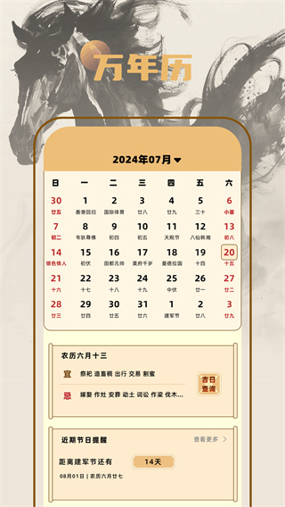 支持传统黄历查询功能,用户可以一键查看每日宜忌事项,还能快速获取全年黄道吉日信息,为重要活动提供参考。无论是结婚、开业还是搬家,都能找到最适合的良辰吉日。