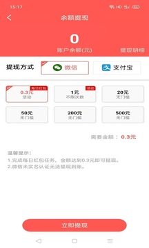 降低提现门槛,0.3元起即可申请提现,1元、20元、50元多种提现额度任您选择。超低提现门槛让收益快速到账,无需长时间等待,轻松兼职,等您来赚钱!