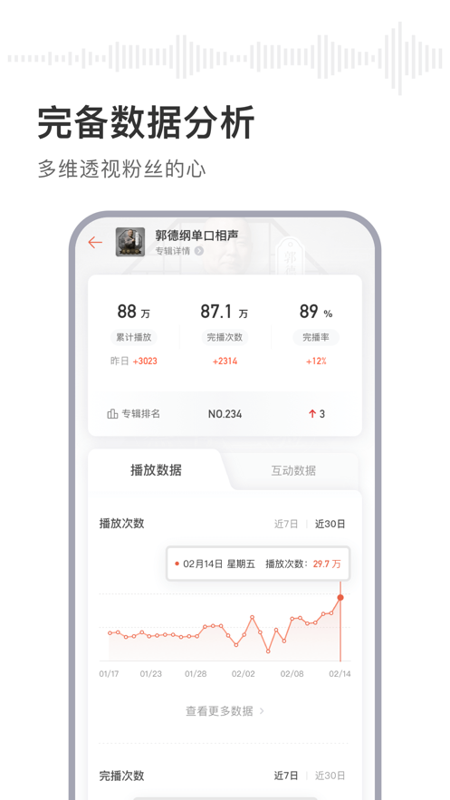 移动端即可完成专辑管理、粉丝互动、节目优化等全方位运营工作。创新的可视化操作界面让复杂的运营工作变得简单高效,随时随地掌握账号动态,不错过任何与粉丝互动的机会。